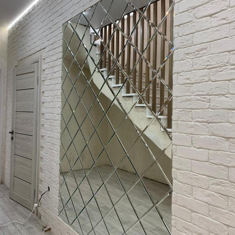 Использована серебристая квадратная зеркальная плитка размером 18х18.
